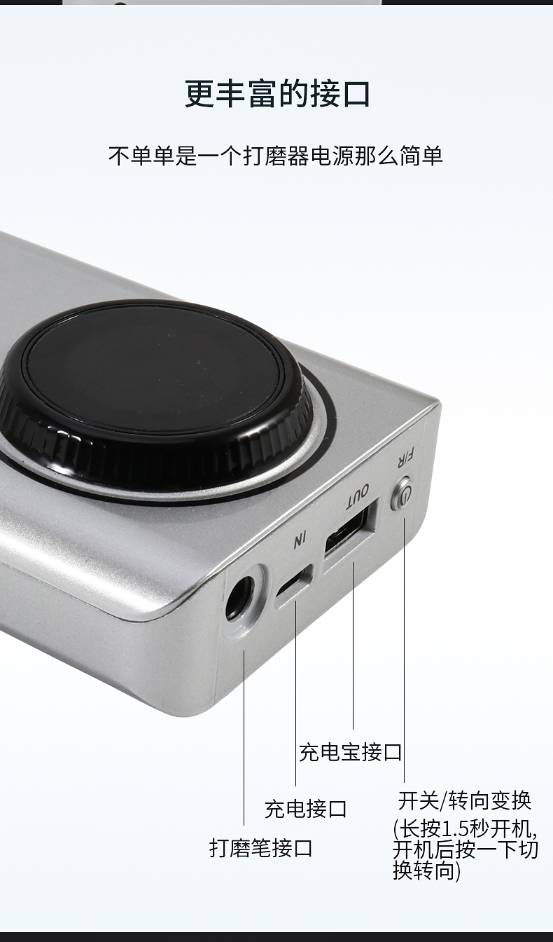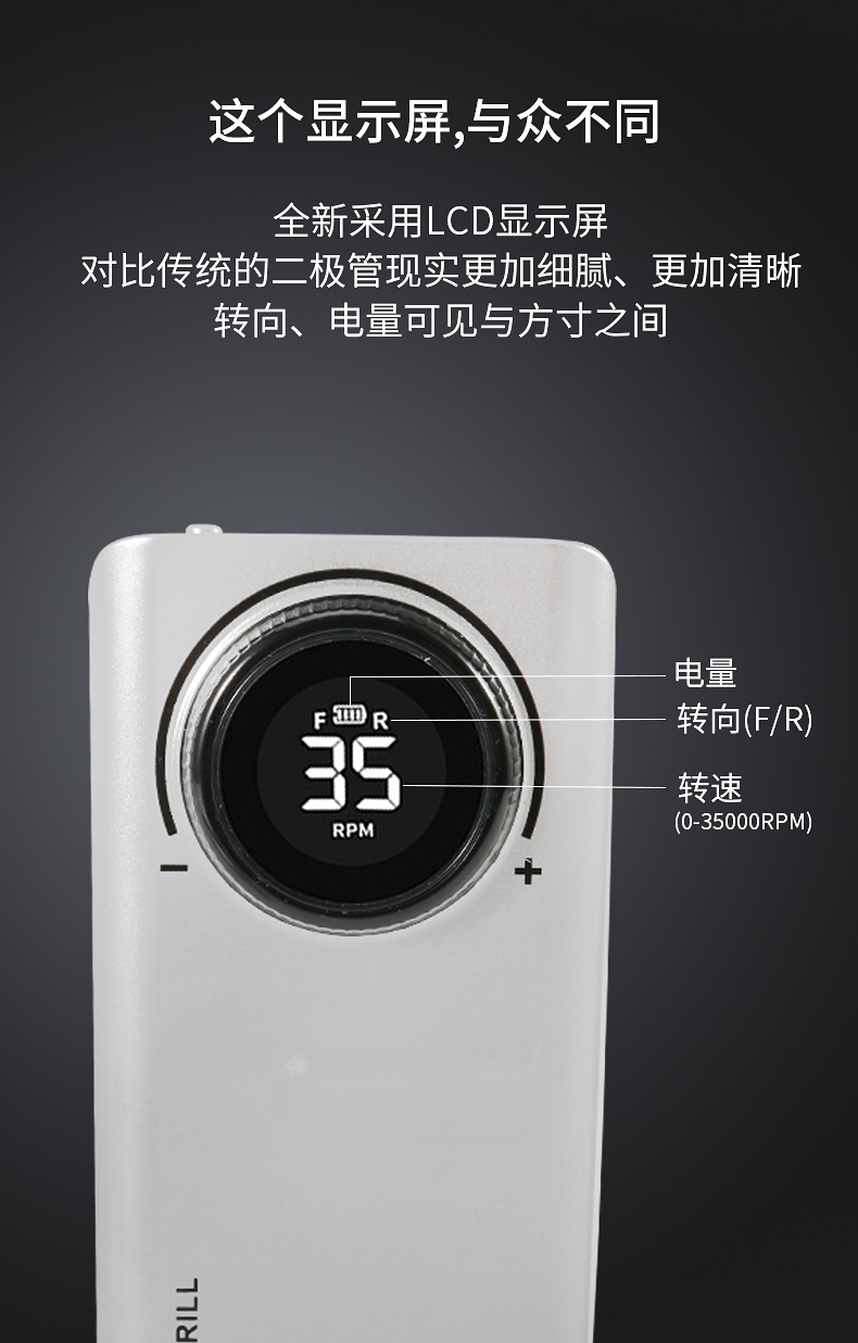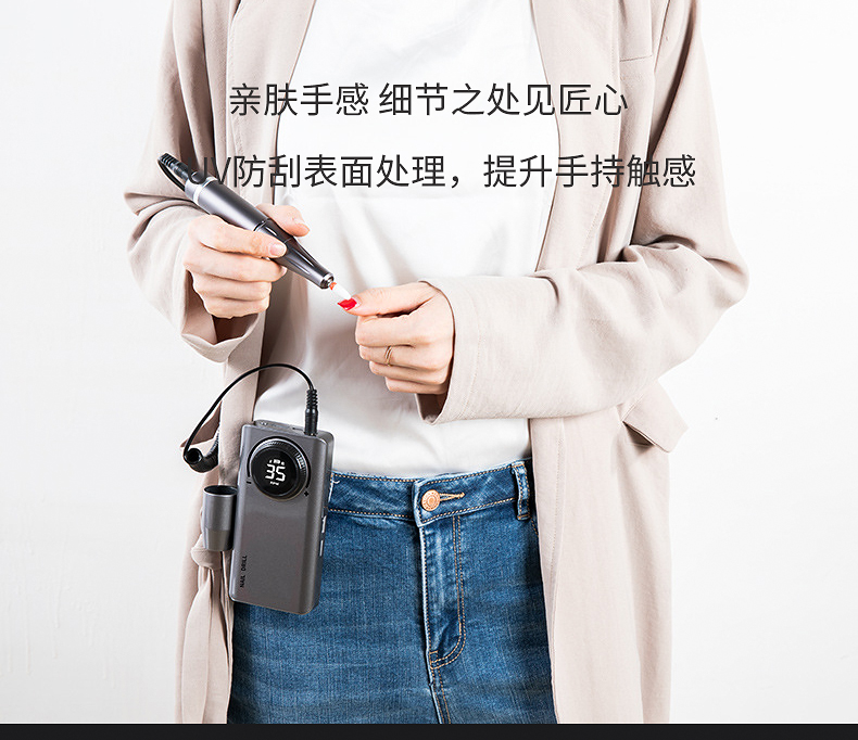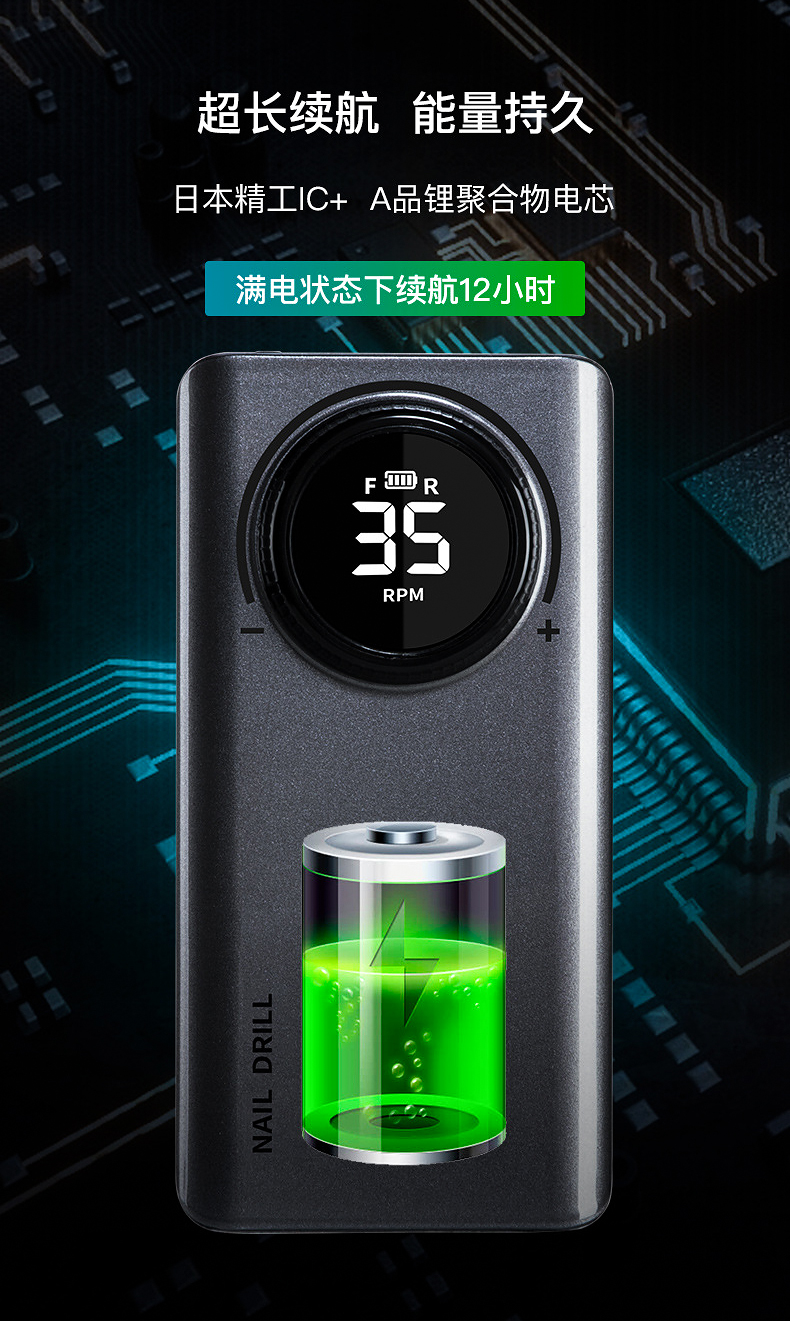 多功能35000转便捷式美甲打磨机,告别传统晶体管显示屏,全新LED显示屏显示,转向、电量、转速一目了然,精工IC+,A品锂聚合物电芯,超长续航,满电状态下可续航12小时,不单单只是打磨机这么简单,可当充电宝给手机充电,一机可多用 如需订货请联系18957996919(微信同号)