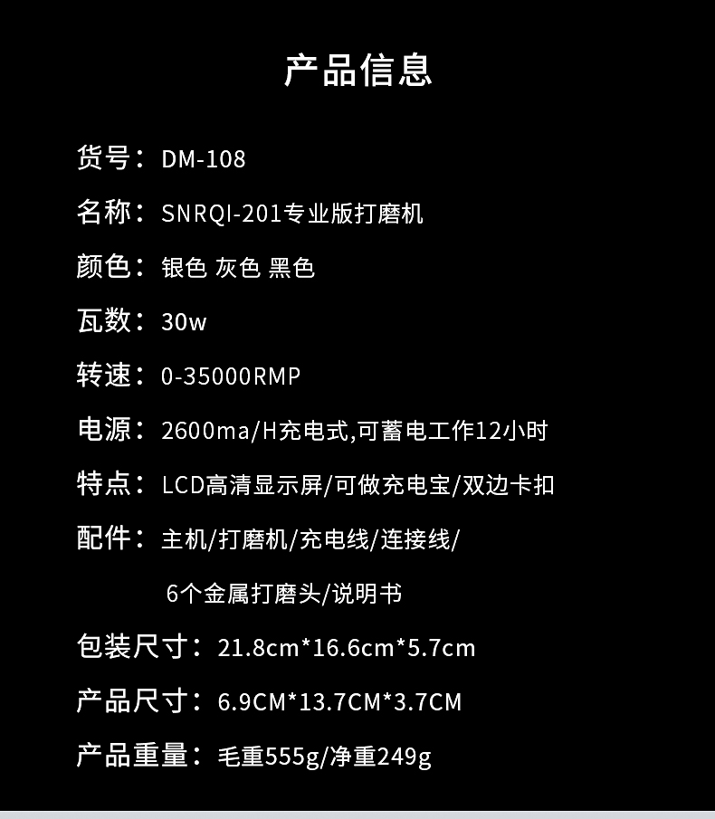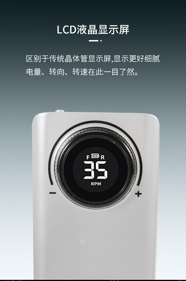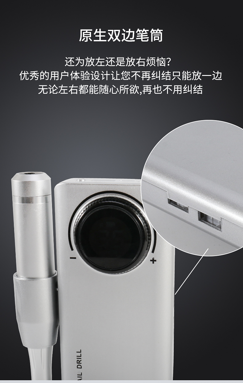 多功能35000转便捷式美甲打磨机,告别传统晶体管显示屏,全新LED显示屏显示,转向、电量、转速一目了然,精工IC+,A品锂聚合物电芯,超长续航,满电状态下可续航12小时,不单单只是打磨机这么简单,可当充电宝给手机充电,一机可多用 如需订货请联系18957996919(微信同号)
