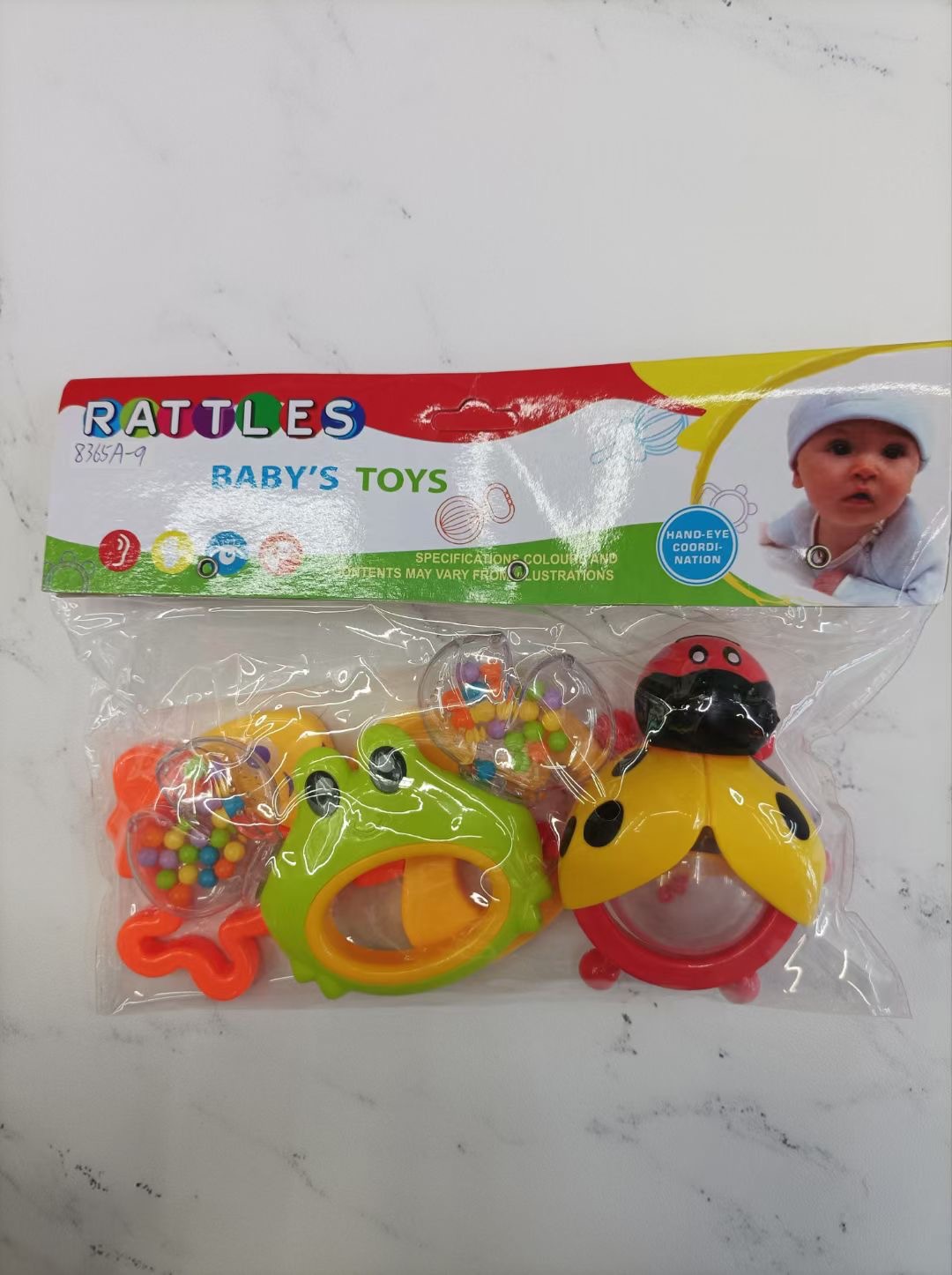 品名:4只摇铃货号:8365A-9外箱尺寸:66.0*45.0*75.0装箱数:192净重:28包装:PVC卡头袋