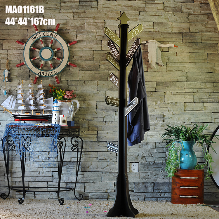 非常有特色的一款衣帽架。是设计师乔治2012年设计的新款挂架。有强烈的欧式风格。新奇漂亮和实用,始终是设计师设计此款产品的前提。宝贝的创意来自于道路路牌,很独特!放在客厅或者卧室,非常吸睛。当然买家们更多用于餐馆,咖啡厅,衣帽店,手包店等等店铺的装饰。可以当衣帽架收纳顾客的随身物件,也可以挂饰店里面的衣服,手包等等~十分独特。一定会给您的店铺,和产品增色不少。 PS:为了能更好地展现其在碧海晴天之下被海风吹蚀的自然印迹,地中海式的家居饰品都有擦漆做旧处理。产品多为手工制作,不像机械模具产品那么精细完美,但正是这种随性,让宝贝显得非常独特。若您是完美主义者,请慎重考虑!