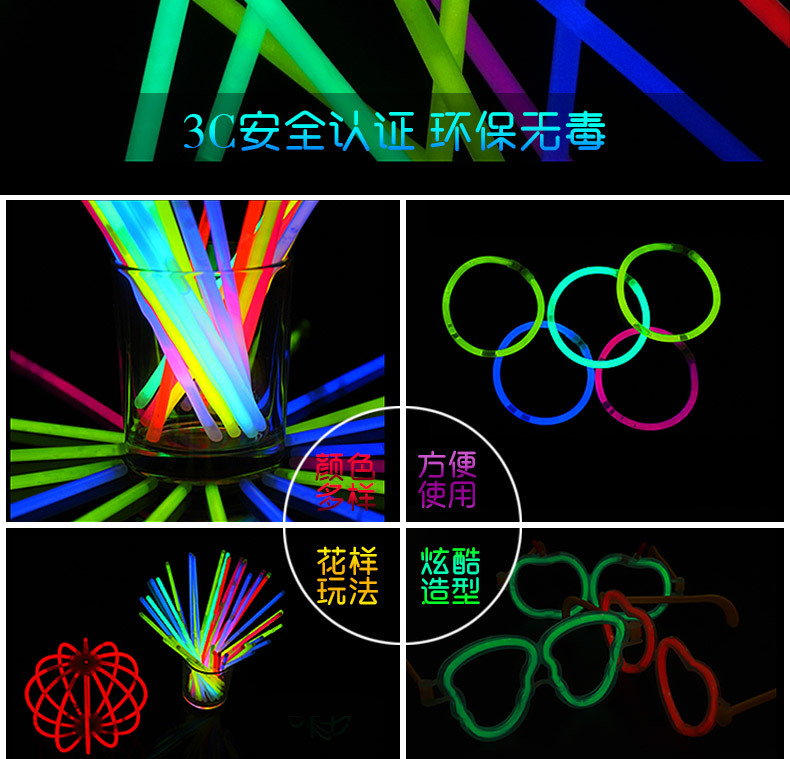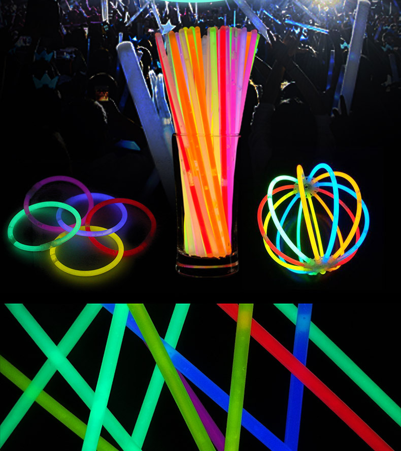 荧光棒色彩绚丽、种类繁多,可用于:演唱会、舞厅、生日、聚会Party、婚礼、宴会、晚会、节日、庆典、郊游、野外露营等场合的照明和装饰;