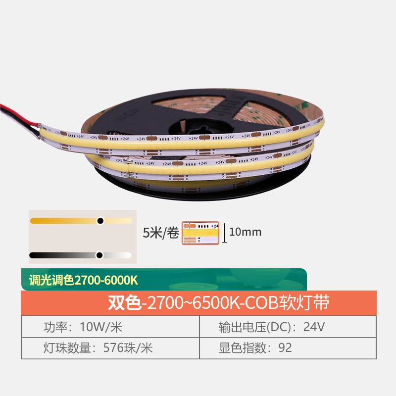 576珠/24V-COB双色灯带-宽10mm智能无极调光调色专用