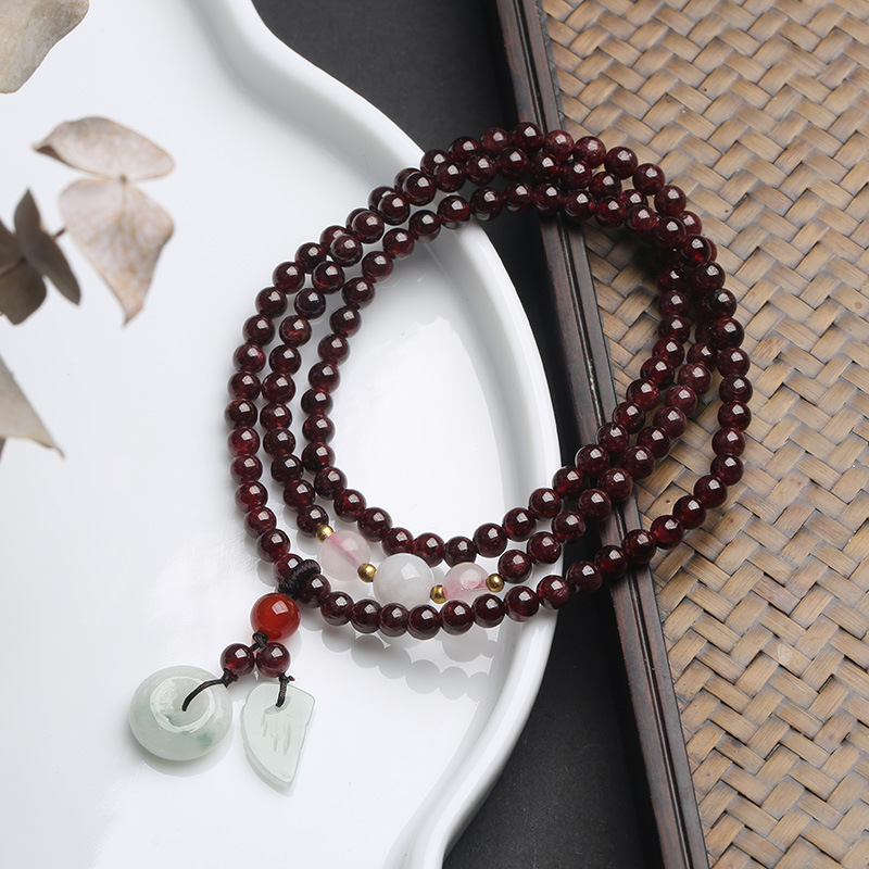4MM三圈石榴石手链吊翡翠平安扣