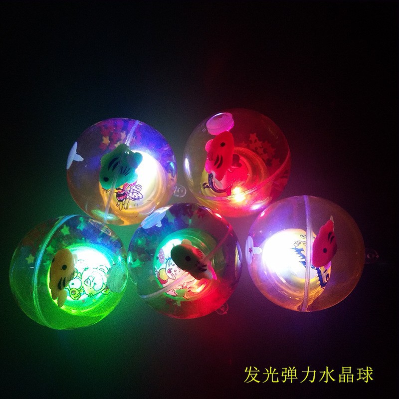 地摊夜市热销10元一个产品名称:发光水晶球、地摊货源、跳跳球产品尺寸:5.5,6.5公分带绳子和不带绳子(带绳子的都是3款混:鱼、恐龙、鸭子混装,6.5不带的是鱼)产品包装:12个一小盒装箱数:5.5的是192一件,6.5是144一件,7.5的120一箱重量:160克闪光弹力跳跳球内置红蓝两色LED灯,发出七彩闪烁光芒,在灯光的照耀下很是漂亮!圆形的小球,震动开关,球往地上扔下或敲一下弹跳一下球就会闪亮,闪一会后自动熄灭,再震动再亮。在弹跳的时间发出七彩光芒,十分可爱。它无毒环保,弹力很大,不易破损,很好玩哦。相信小朋友看到都会爱不释手!夜市地摊创业也是一款不错的产品哦。此款产品外贸出口非常热销,近期内销市场需求量在迅速增加,抢占商机!宝贝材料:透明橡胶 弹力很强宝贝颜色:多色混发宝贝说明:闪光弹力跳跳球内置LED灯,发出七彩闪烁光芒,内置不同颜色的塑料小球和可爱的金鱼在游动(随机发货不挑)在灯光的照耀下很是漂亮!圆形的小球,震动开关,球往地上扔下或敲一下弹跳一下球就会闪亮,闪一会后自动熄灭,再震动再亮。在弹跳的时间发出七彩光芒,十分可爱。它无毒环保,弹力很大,不易破损,很好玩哦。相信小朋友看到都会爱不释手!夜市地摊创业也是一款不错的产品哦