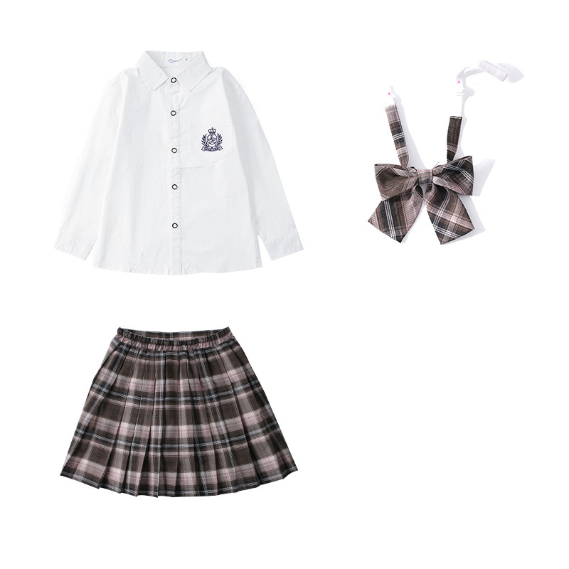 女刺绣白长袖衬衣+咖色格裙+咖色领结