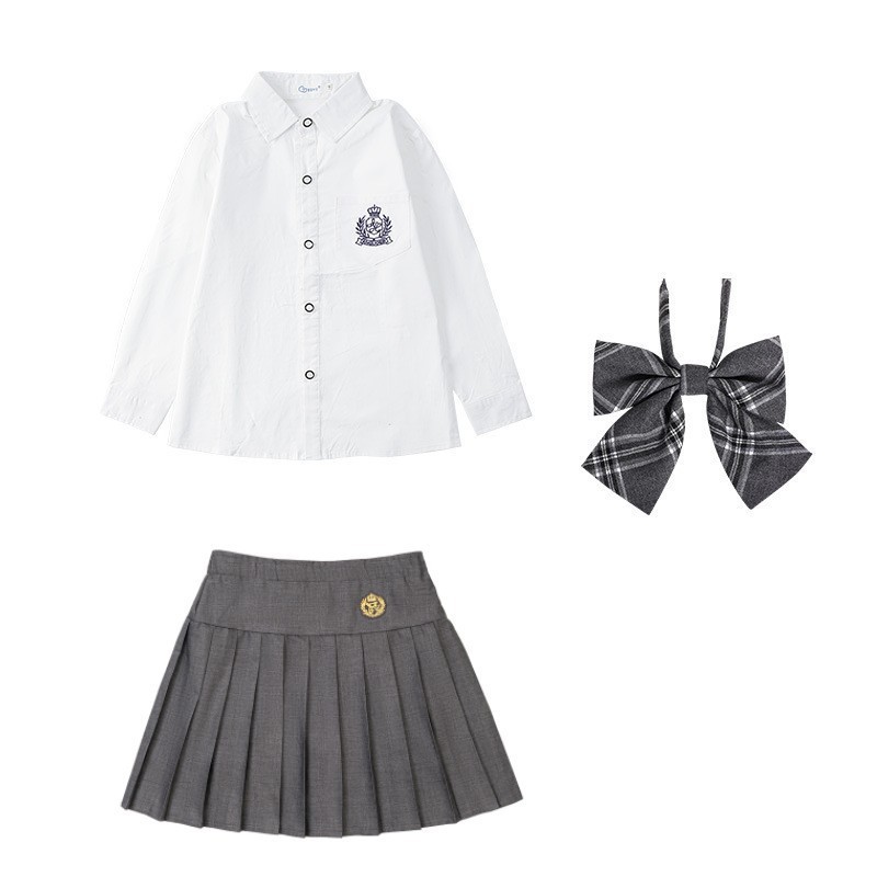 女刺绣白长袖衬衣+灰裙