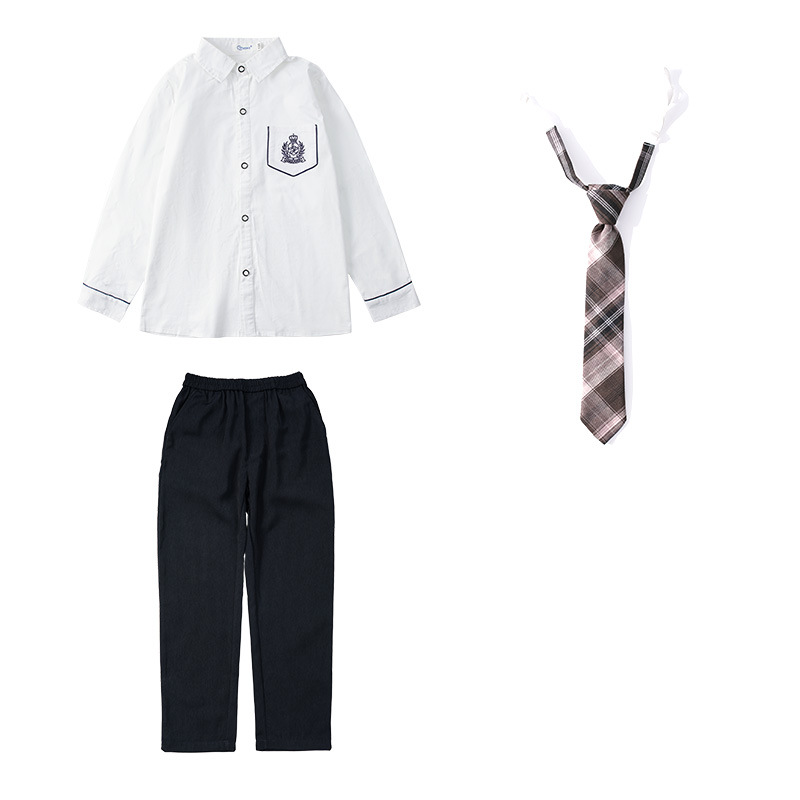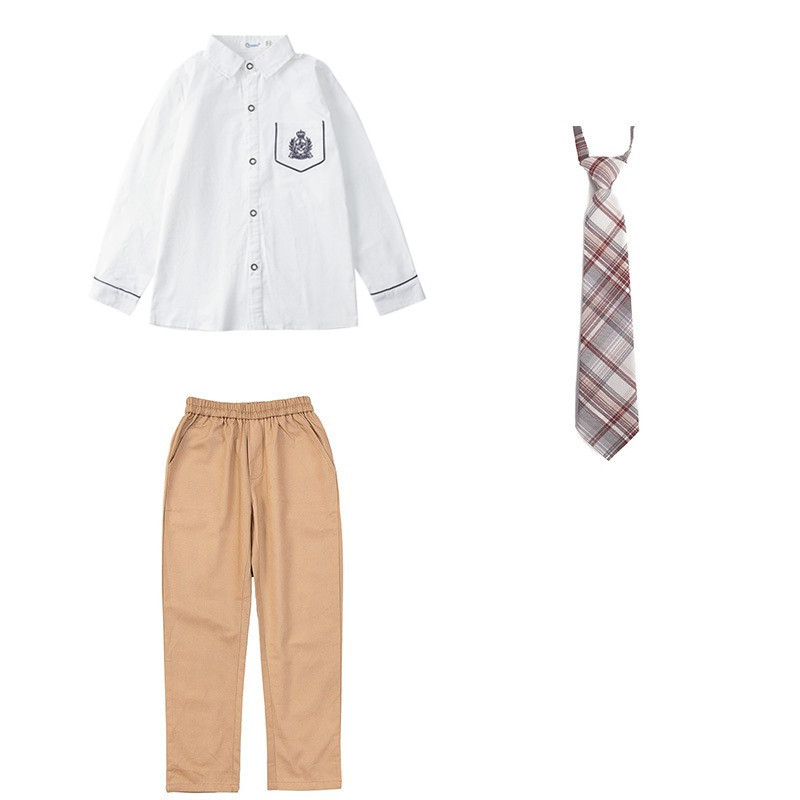 男刺绣白长袖衬衣+卡其裤+卡其领带