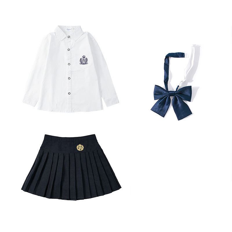 女刺绣白长袖衬衣+藏蓝百褶裙