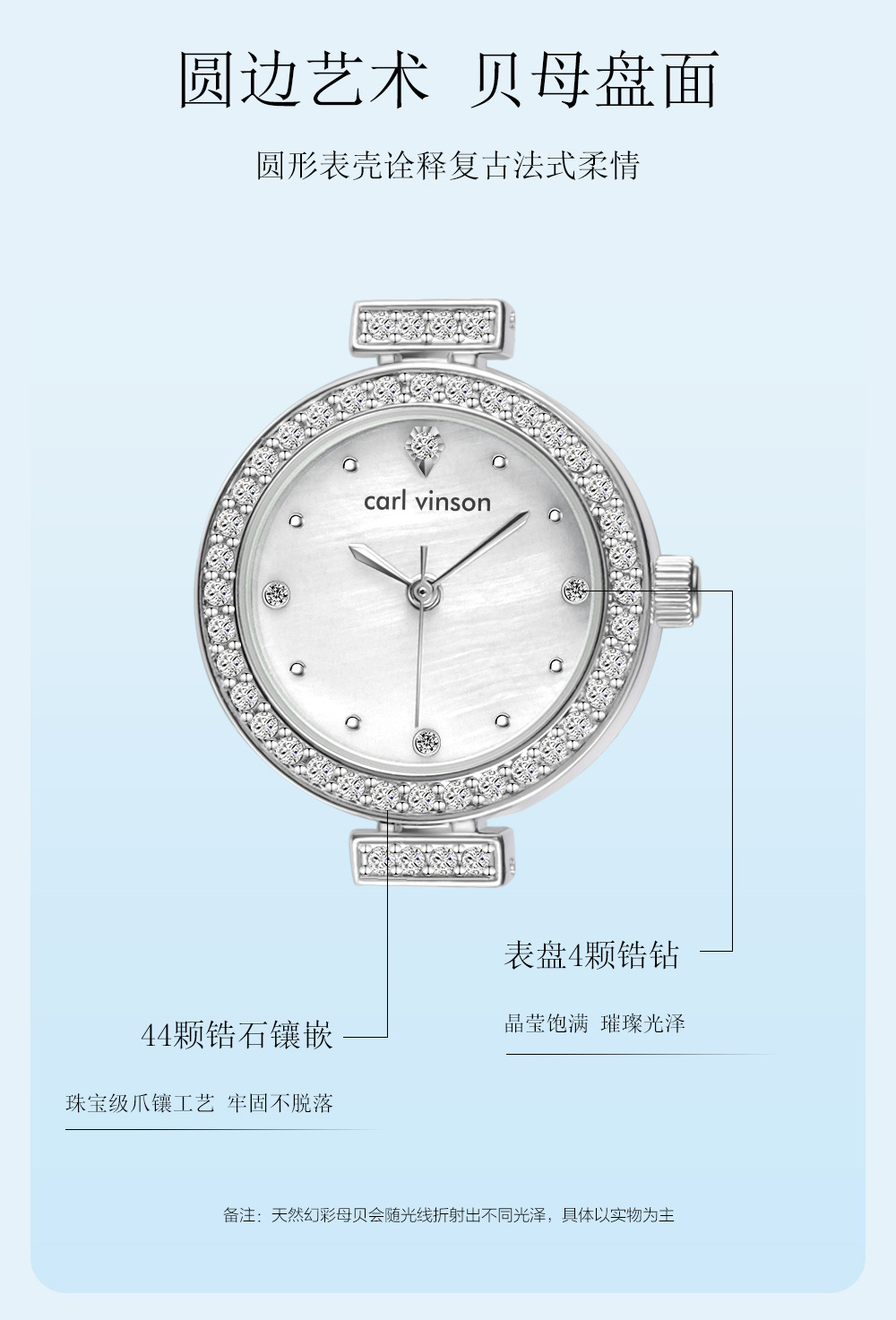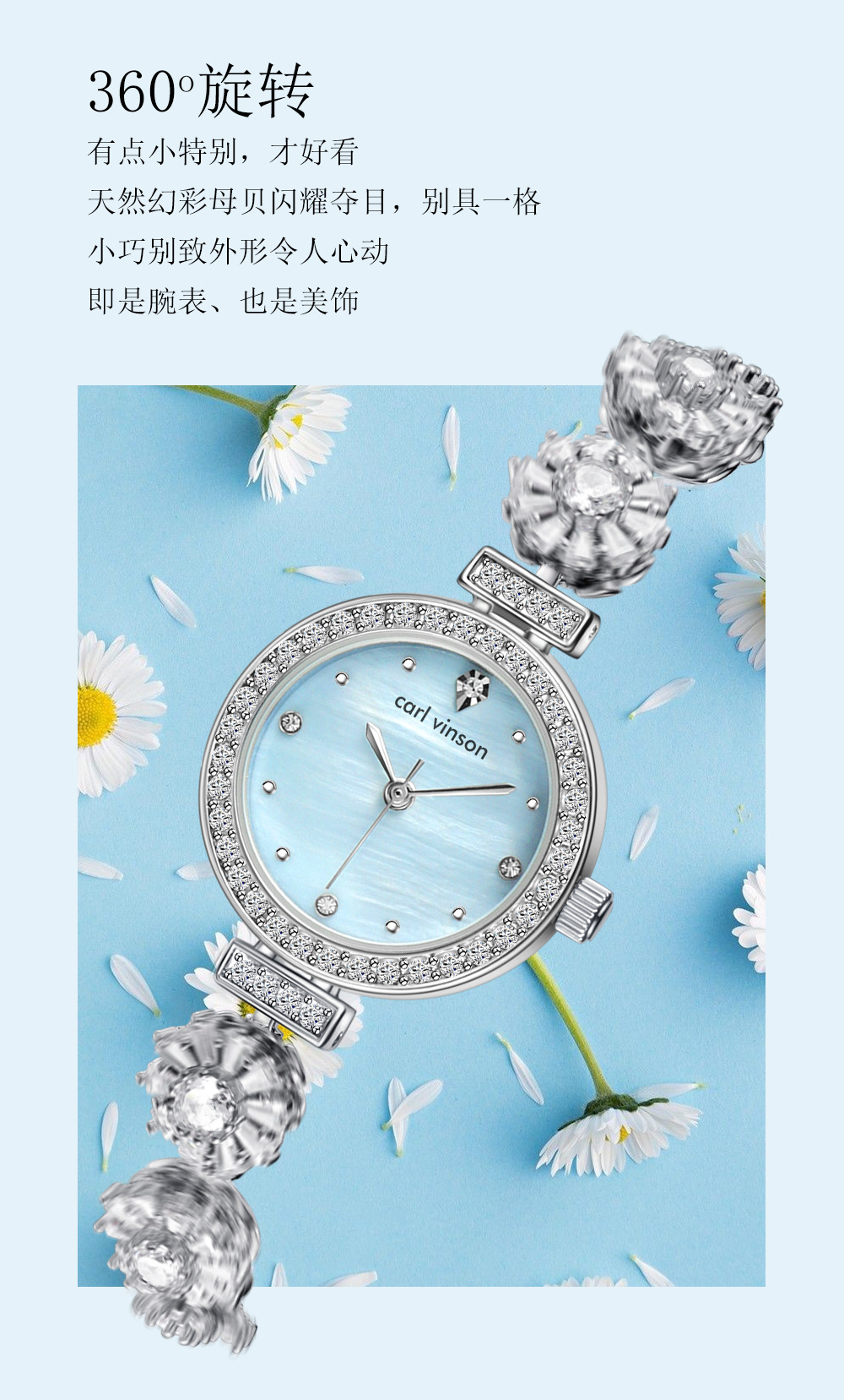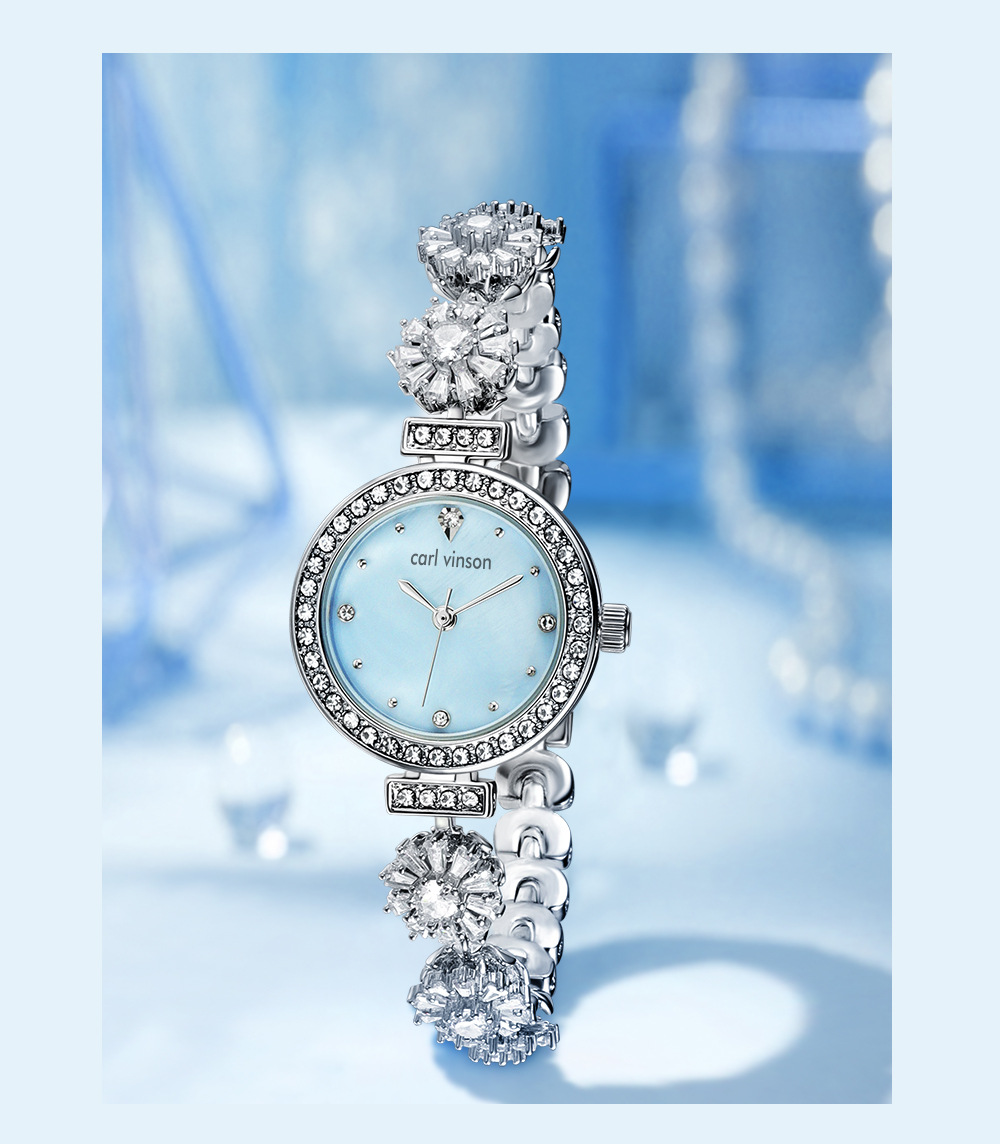 carl vinson奢华镶钻怦然心动梦幻鱼尾女士精致石英手表防水腕表
