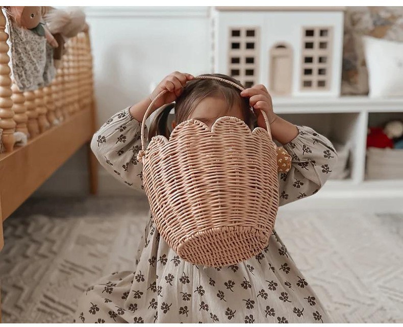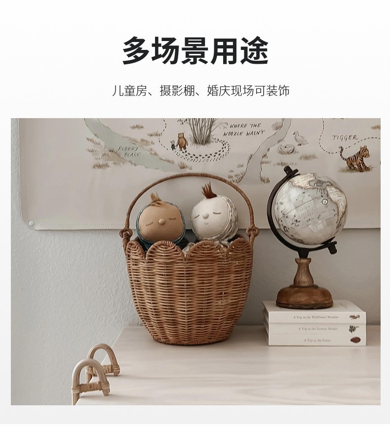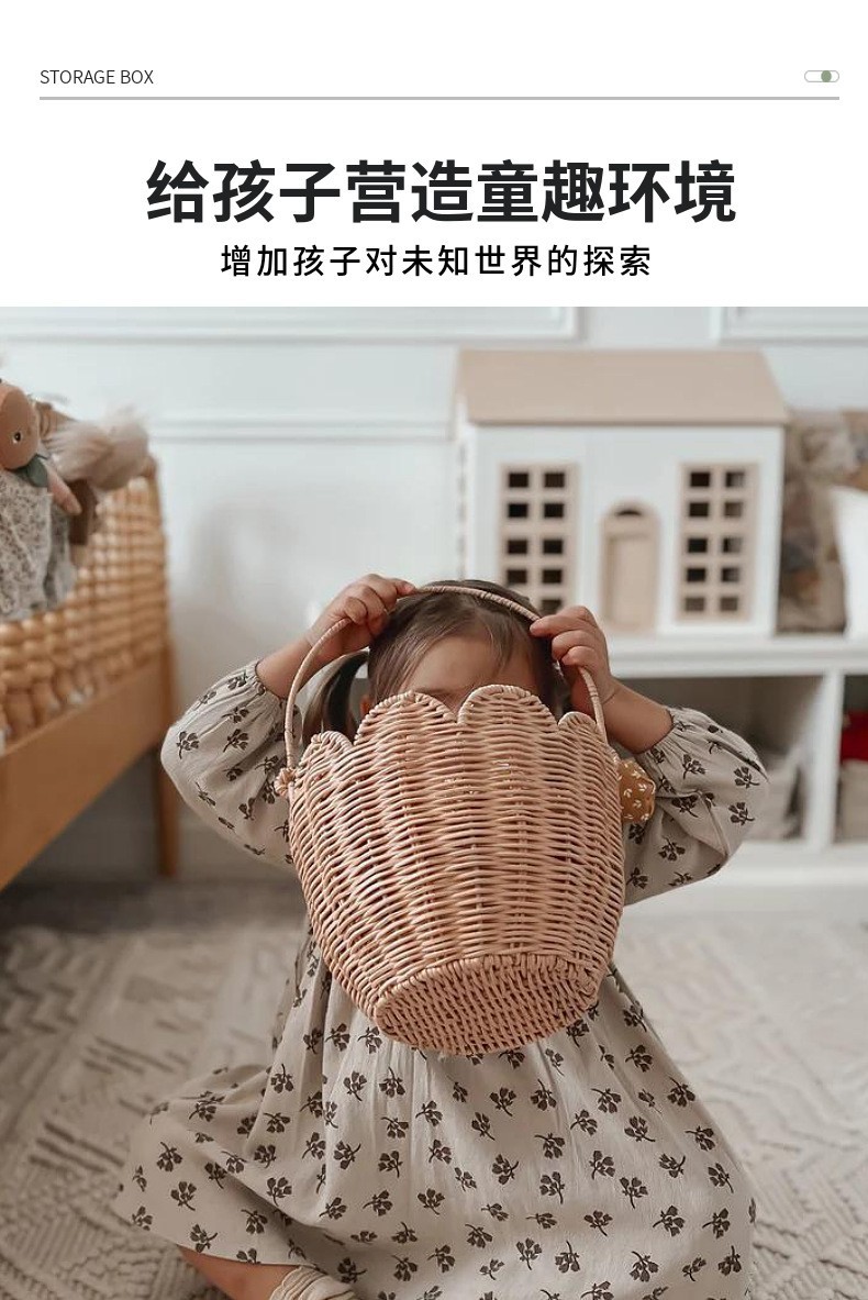 北欧儿童玩具推车天然藤编毛绒玩具收纳筐儿童户外拉杆小推车