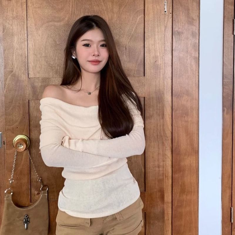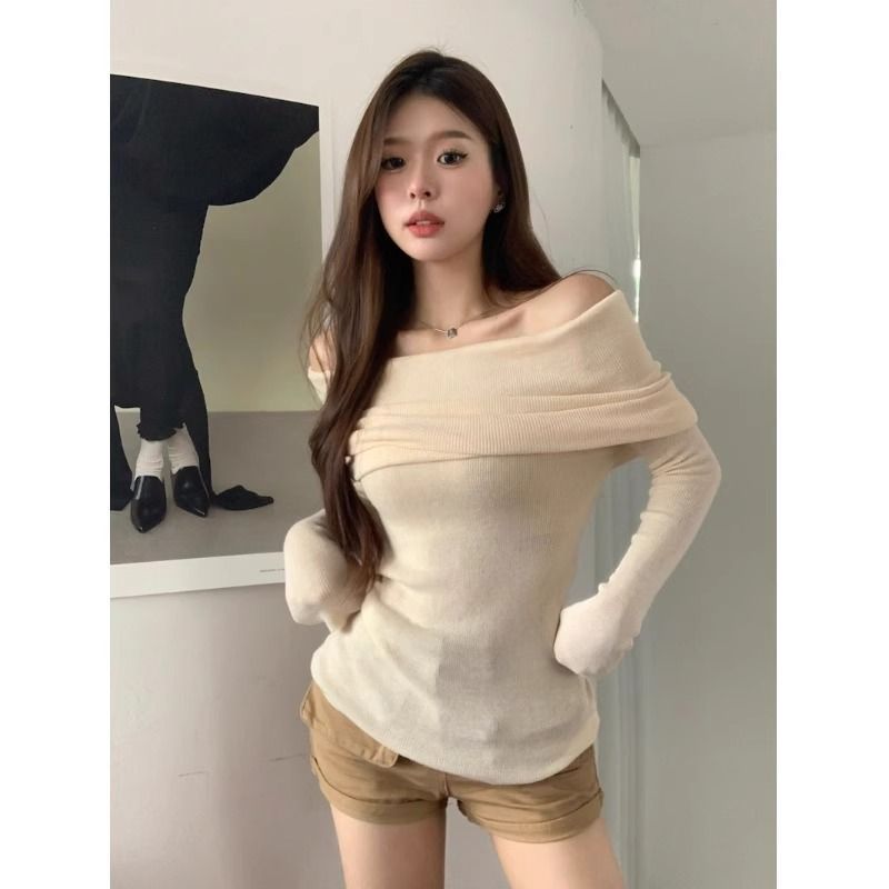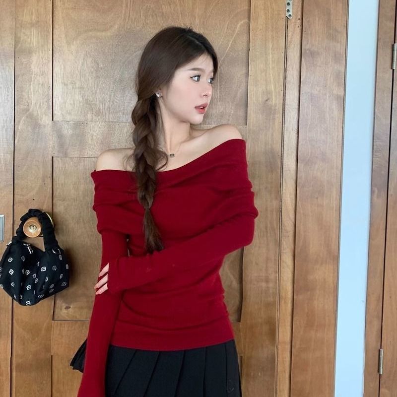 露肩一字肩上衣针织衫女秋装新款修身长袖红色漏肩黑色一字领毛衣