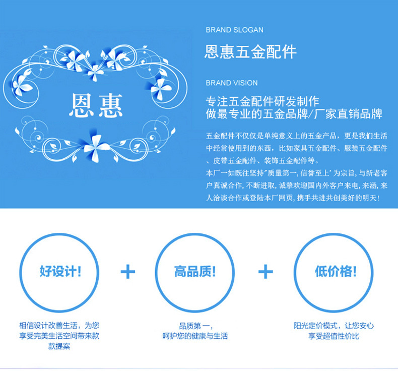 恩惠五金厂是一家专业从事狗扣五金、箱包五金等产品专业生 产加工、研发、生产、销售服务于一体的企业。拥有完整、科学的 质量管理体系,集设计、生产、加工、销售为一体专业生产加工的 公司。恩惠五金的诚信、实力和产品质量获得业界的认可。公司恪 守、质量第一、用户至上 的经营宗旨, 务求为用户生产满意的产 品和最佳的服务。注重产品的开发和质量欢迎各界朋友莅临参观、 指导和业务洽谈。同时,我们本着为客户服务的宗旨,承接客户新 产品开发,来料加工,来样制作等业务。