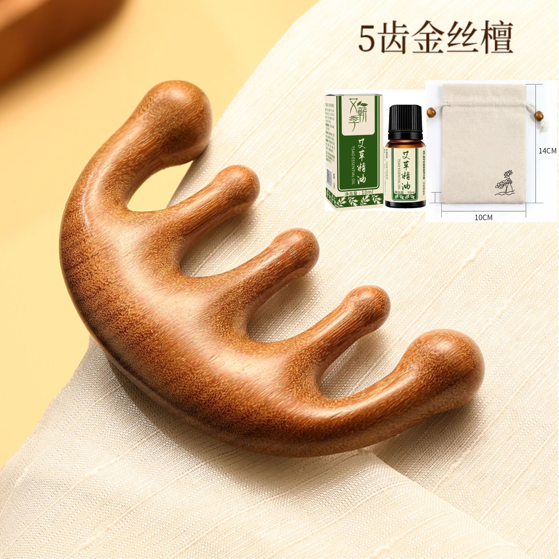 金丝五齿按摩梳【赠布袋+精油+穴位图】