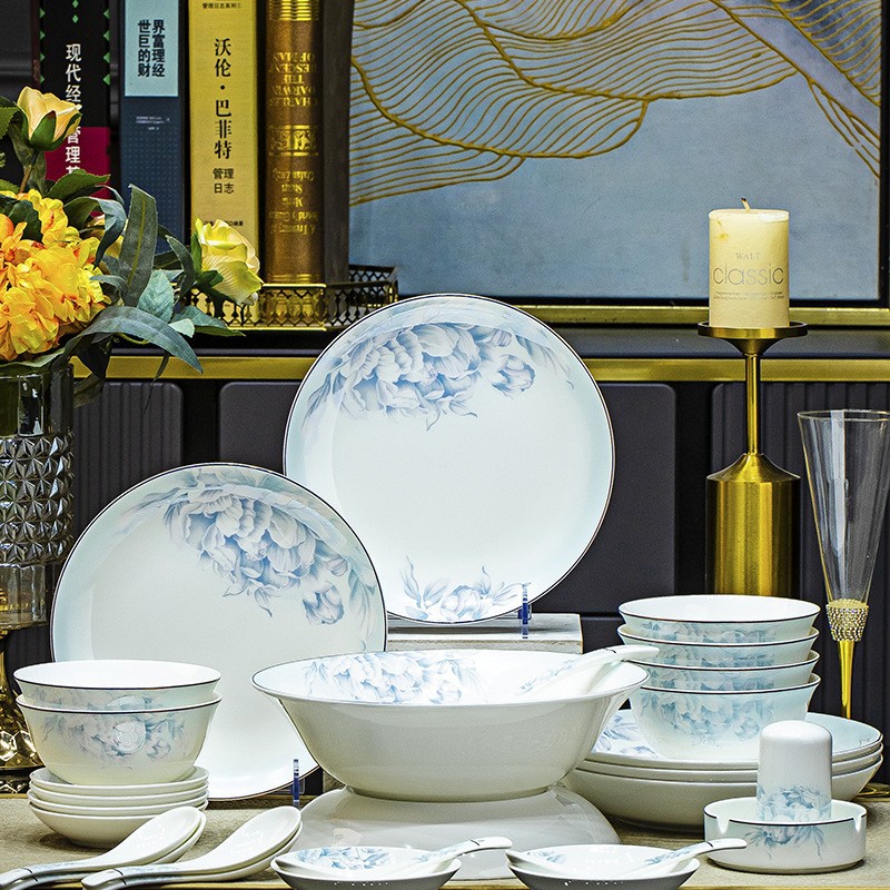景德镇碗碟套装家用轻奢中式骨瓷餐具套装碗盘筷结婚乔迁礼品用瓷