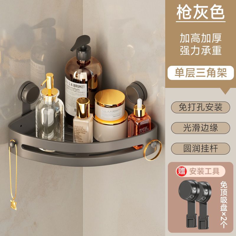 枪灰【加厚】吸盘安装-易拆洗【ABS材质】-【单层】三角篮置物架+带钩