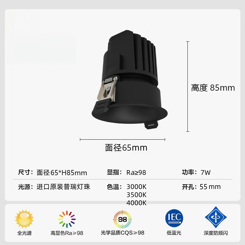 射灯款弧面无边框-黑杯-75开孔-7w