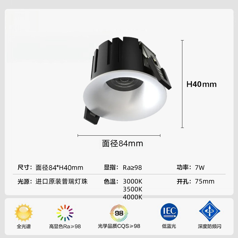 射灯款弧面无边框-白杯-75开孔-7w