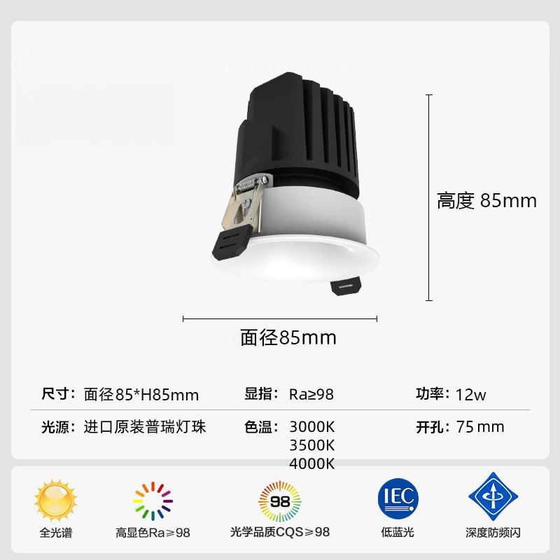 射灯款弧面无边框-白杯-75开孔-12w