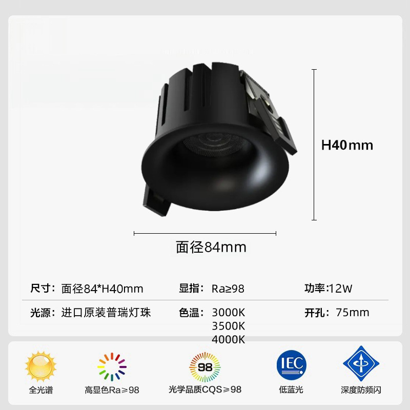 筒灯款弧面无边框-黑杯-75开孔-12w