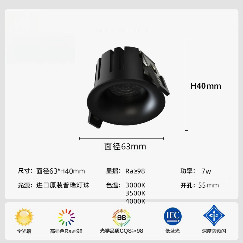 射灯款弧面无边框-黑杯-55开孔-7w