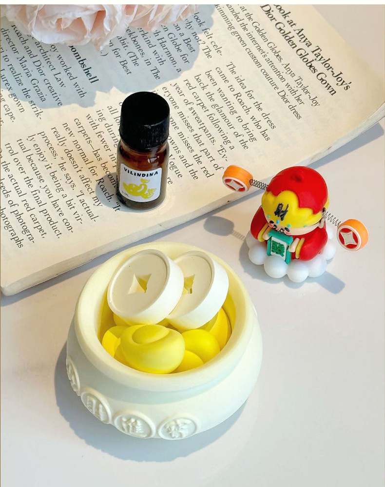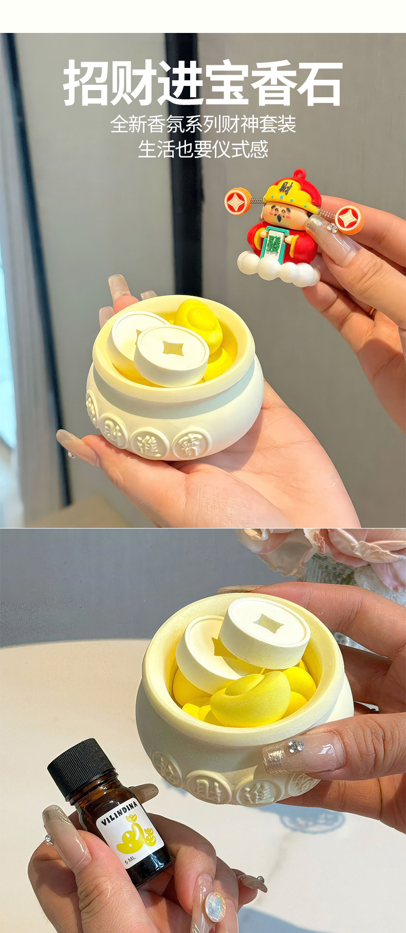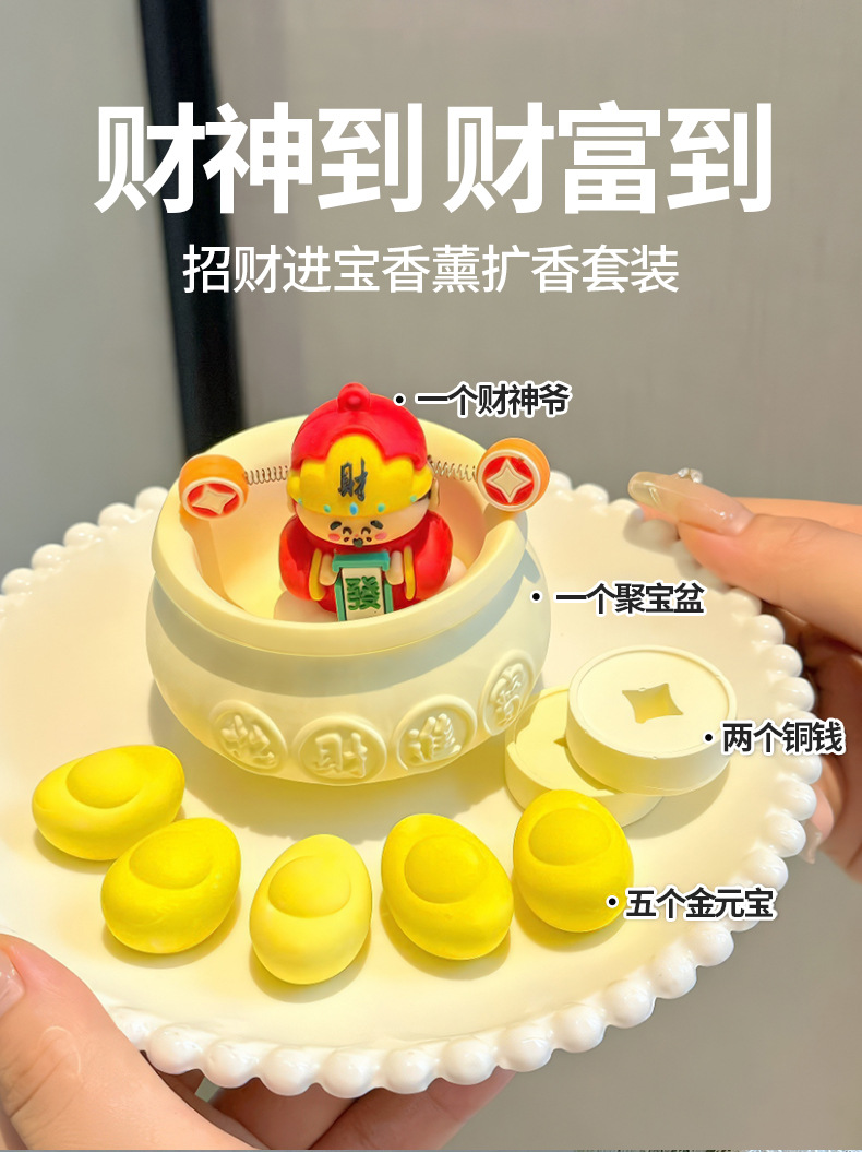 【产品尺寸】:财神约7*4*5CM, 元宝约3.2*1.7*2cm, 铜钱直径约3cm ,高约1cm, 精油直径约1.4cm, 高度5.7cm, 聚宝盆直径约8cm ,高度约4.2cm