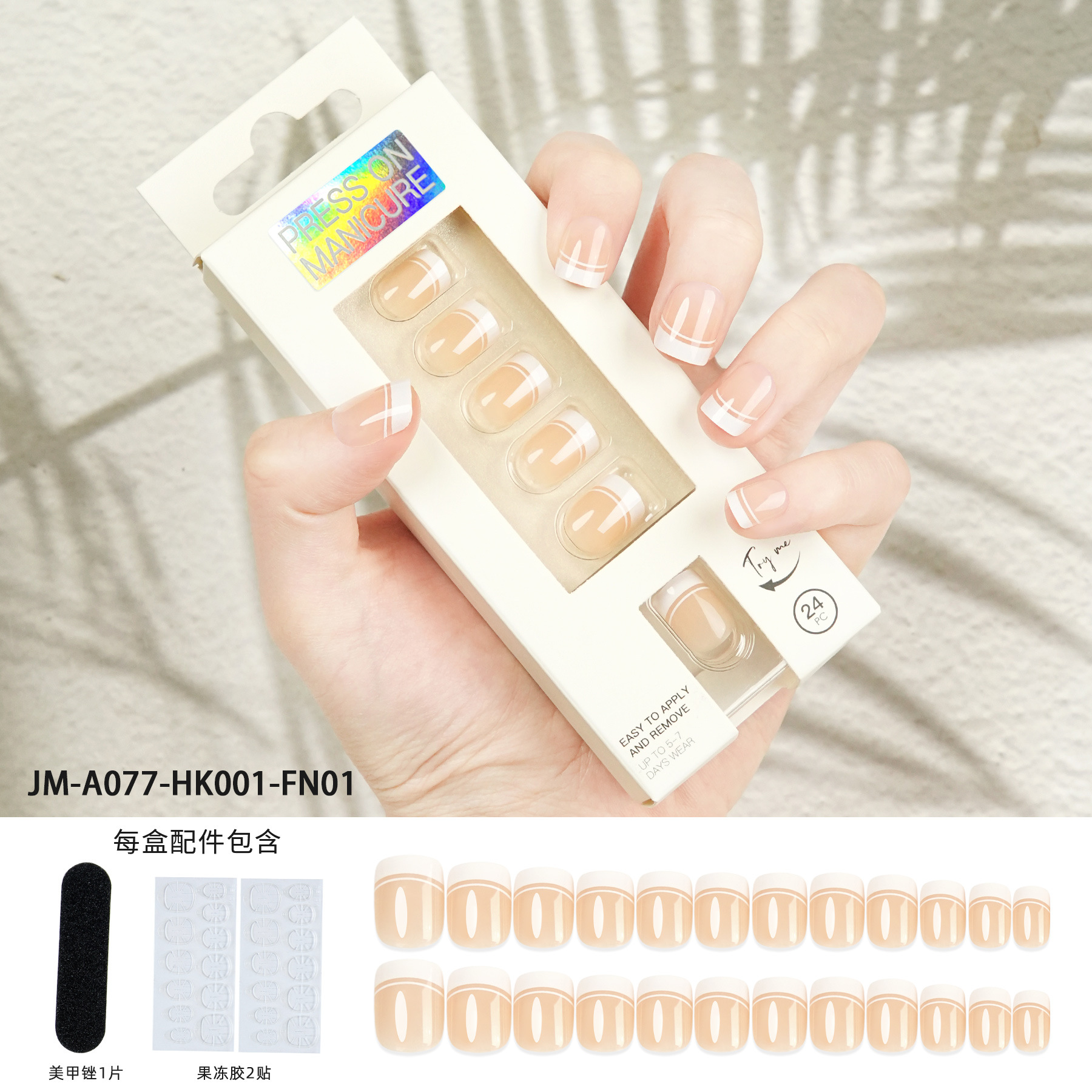 【包装方式】24片指甲+2张背胶贴+1个打磨锉 单盒尺寸:14.5*5.3*2CM 单盒重量:25g