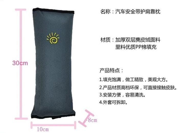 汽车安全带都是为成人设计的,由于儿童身高还不够,系上安全带之后,安全常常会穿过脖子,紧急刹车或发生意外的情况下就变得非常危险,容易勒伤或割伤。此款安全带护肩安装在安全带上,当紧急刹车时可在一定程度上保护乘车儿童的脖子;正常情况下,儿童也可枕着护肩休息。大肩带主要为保护儿童安全,欧洲行车安全法为儿童必须装置