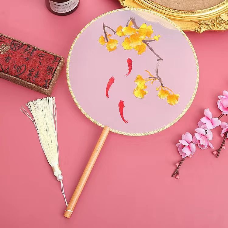 工厂批发刺绣扇子中国风旗袍团扇透明机绣宫扇古风汉服舞蹈扇