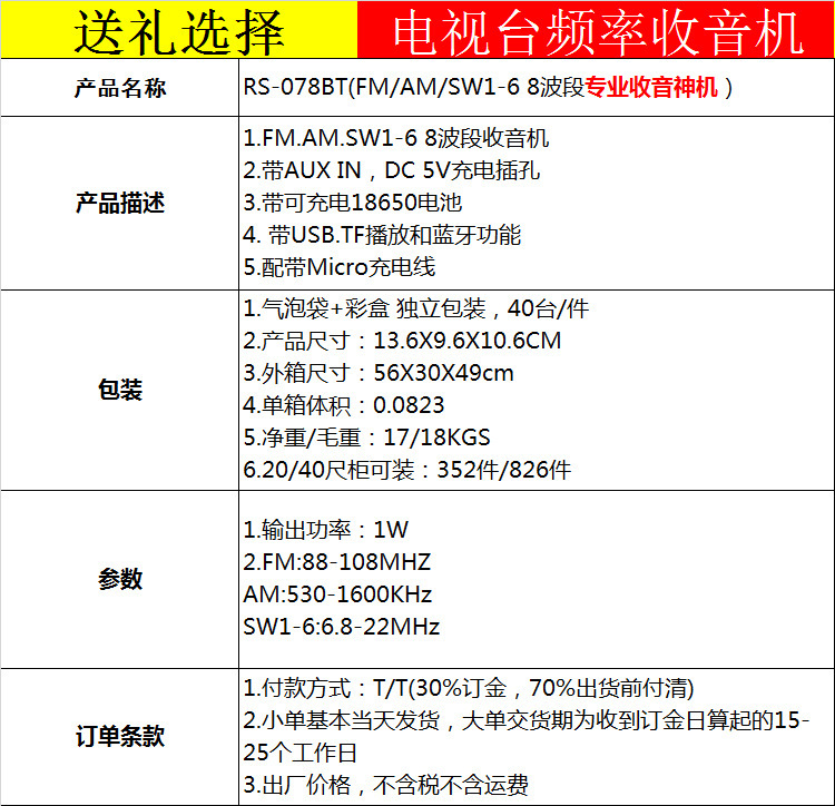 跨境热卖便携复古收音机带蓝牙MP3播放器充电8波段收音机TF/USB