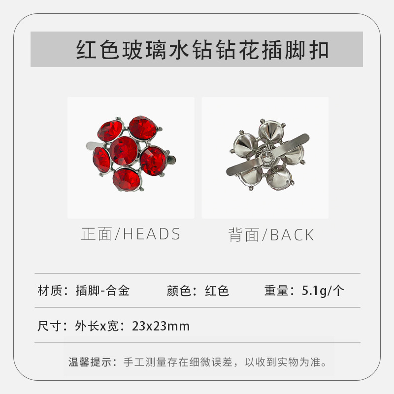A1380--红色玻璃水钻钻花插脚扣--23mmX23mm/个