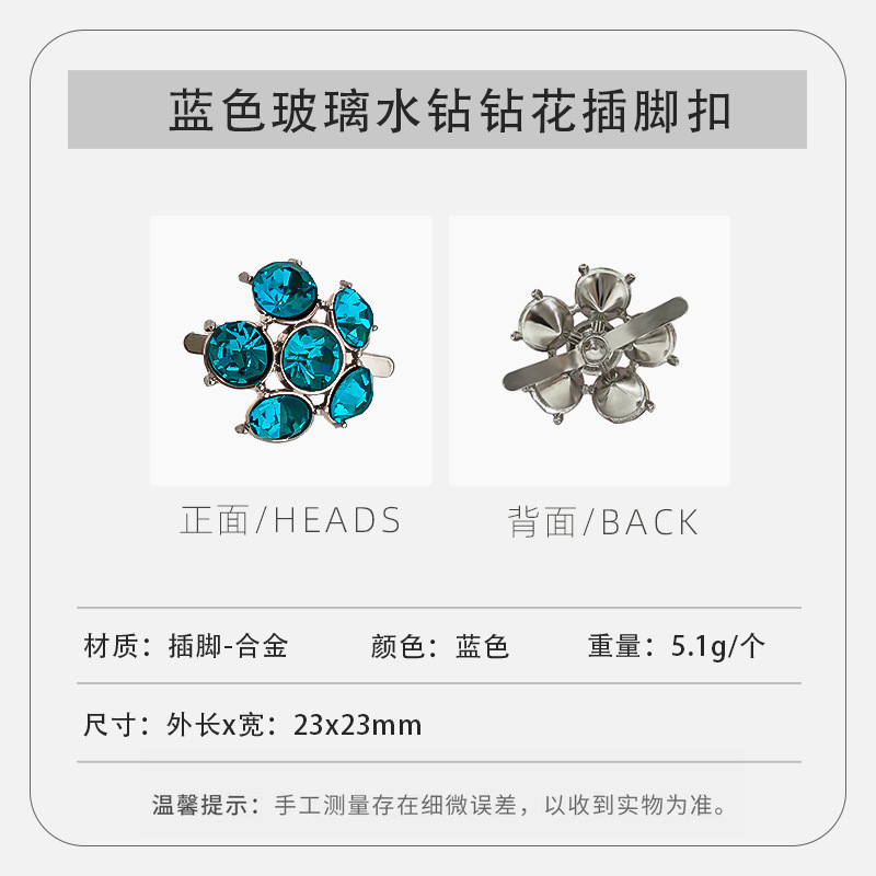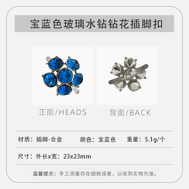 A1383--蓝色玻璃水钻钻花插脚扣--23mmX23mm/个