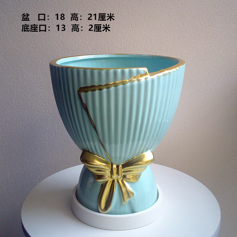 蓝色竖条盆+黑底座