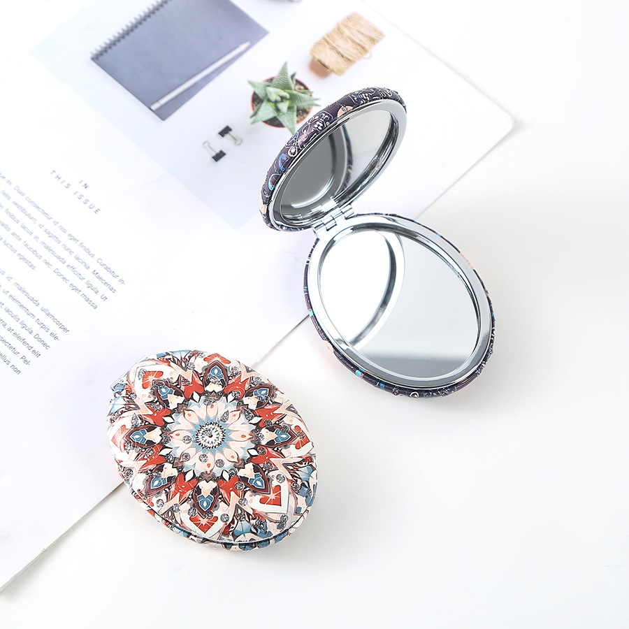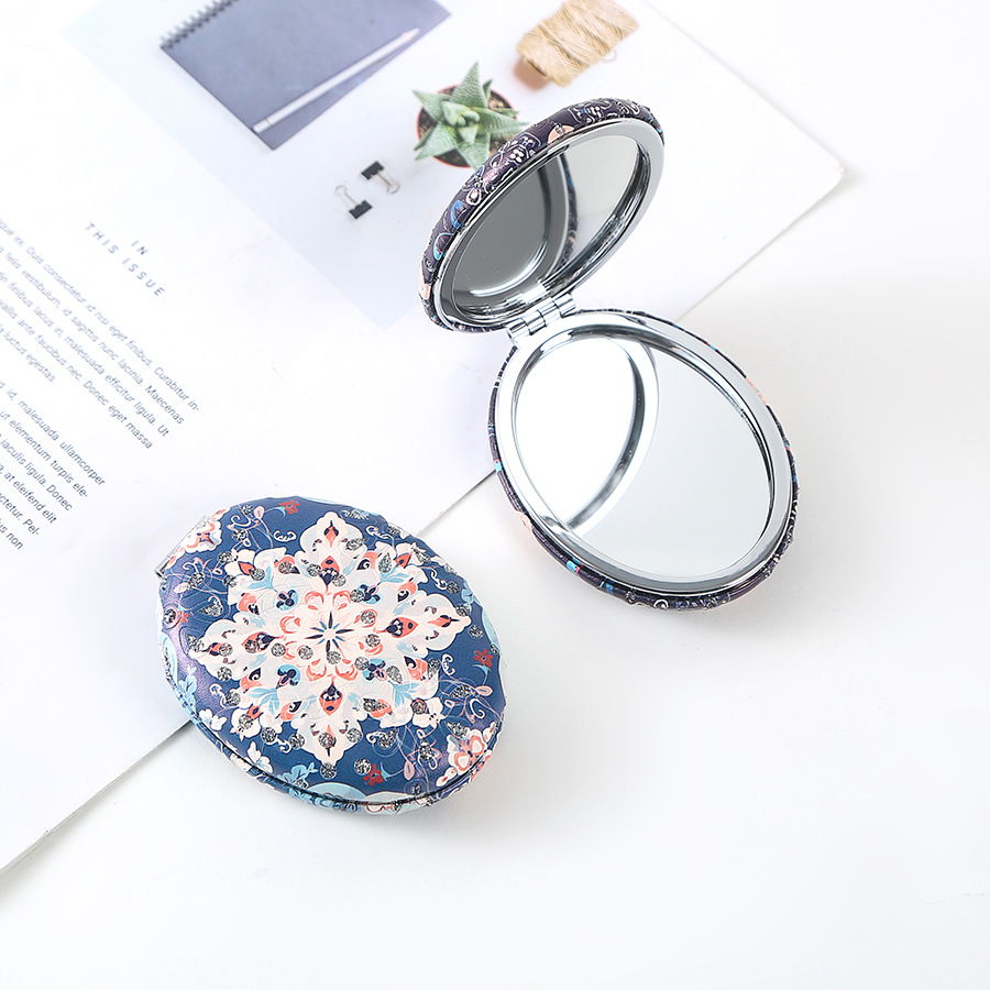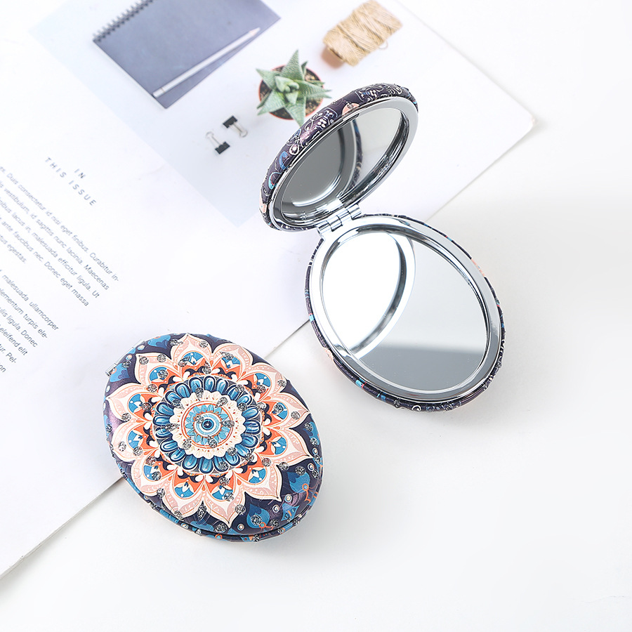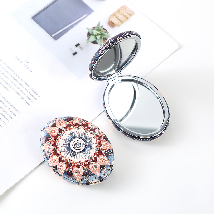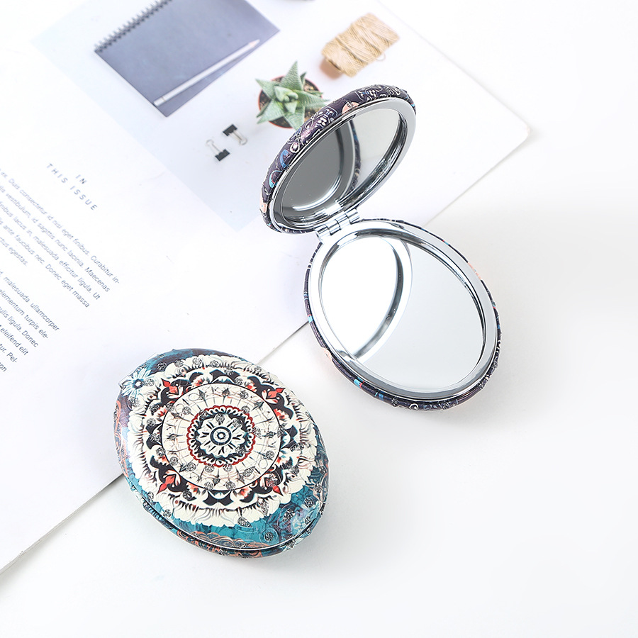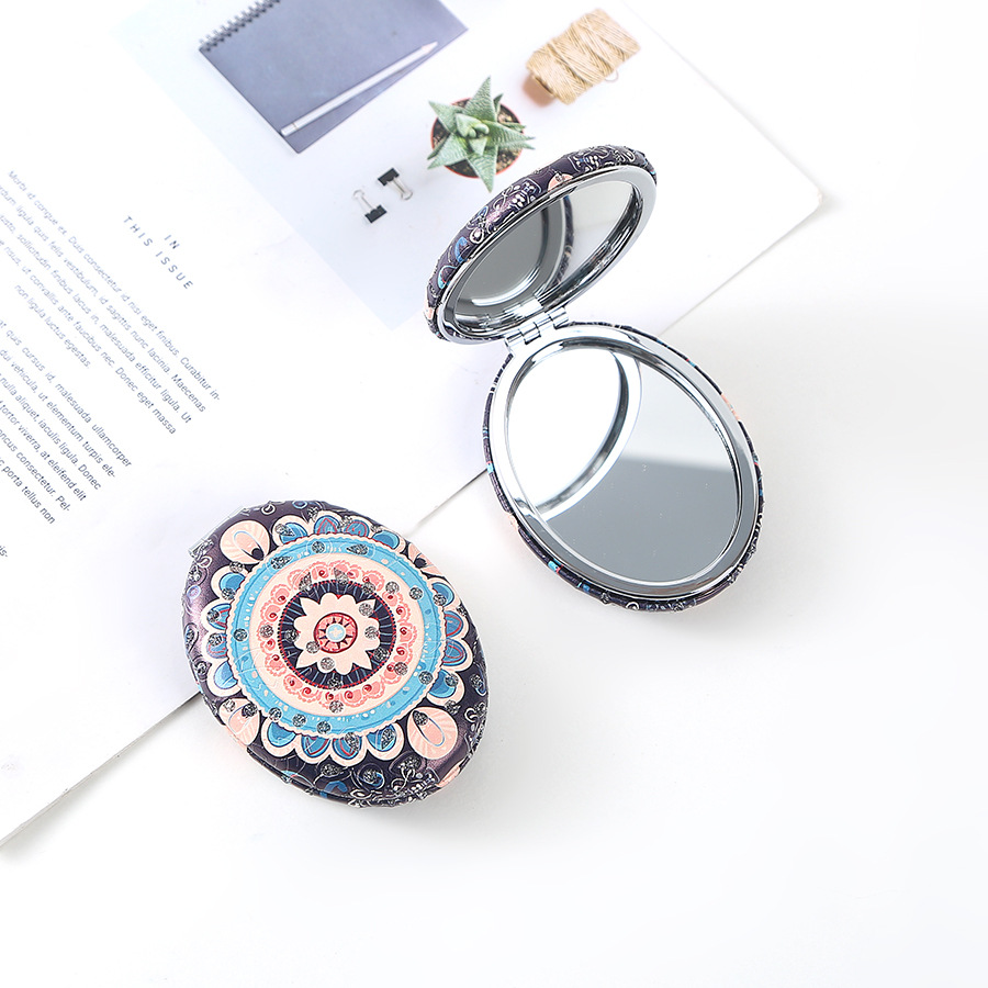 复古椎圆钻粉民族风双面折叠便携化妆镜厚款补妆镜日用百货