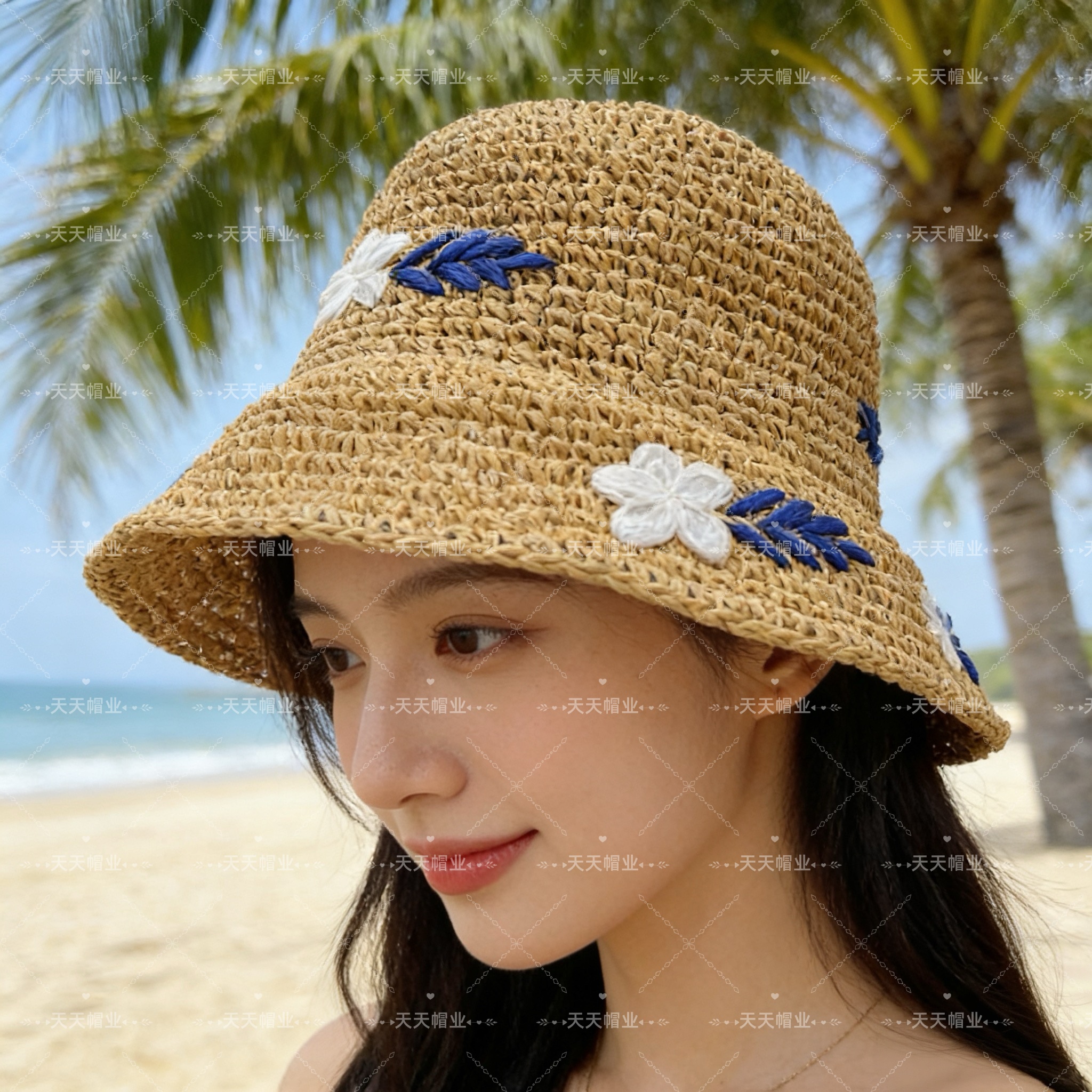新品 外贸专供 蓝白小花草编帽,沙滩防晒帽,纯手工编织帽子,小红书抖音热销款,易收纳可折叠草编织女性沙滩草帽小麦秸草帽秆环保